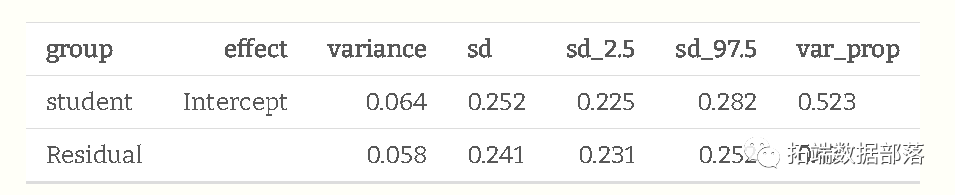 另一种解释方差输出的方法是注意学生方差在总数中的百分比,或0.064 0.122 = 52%。这也被称为类内相关,因为它也是对群内相关的估计,我们将在后面看到。