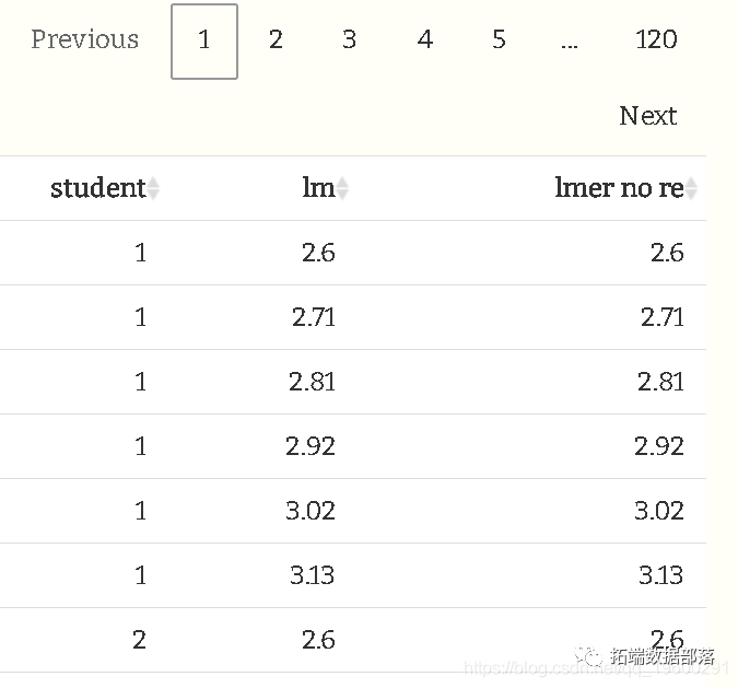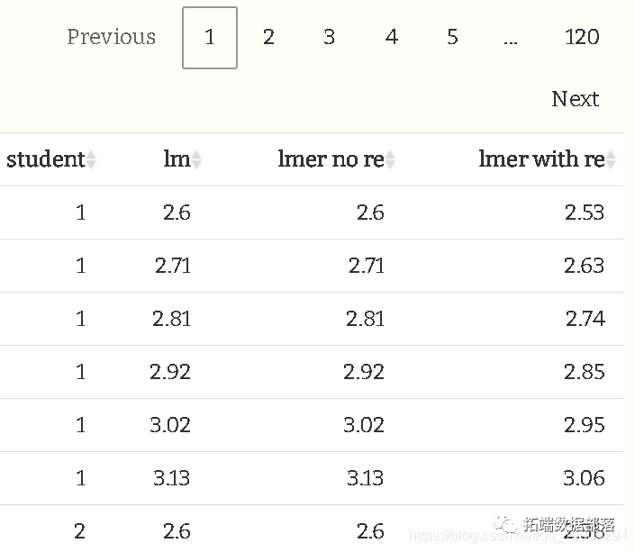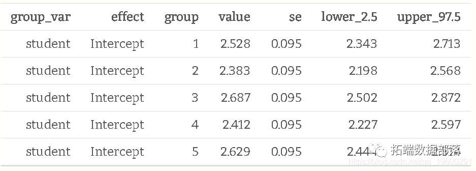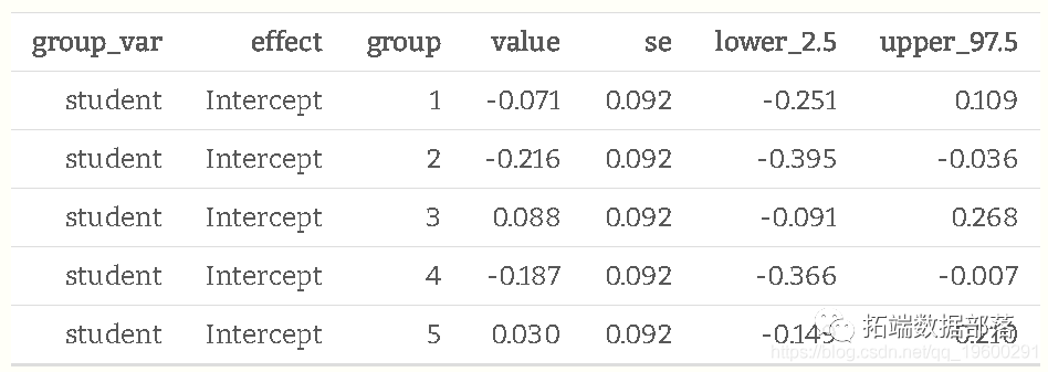 运行模型后,我们实际上可以得到学生效应的估计值。我为前五个学生展示了两种方法,既可以作为随机效应,也可以作为随机截距(即截距+随机效应)。