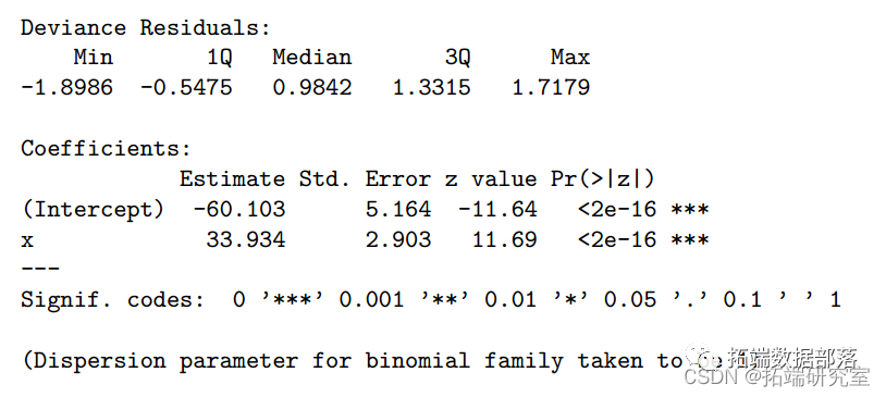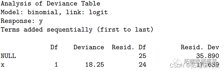 空模型不包含预测变量,在 25 个自由度 (df) 上的偏差为 35.89。当协变量 x 添加到空模型时,偏差的变化是 35.890-17.639=18.25。与自由度为 25-24=1 的卡方分布相比,其 P 值为 1.93 × 10 -5 非常显着。