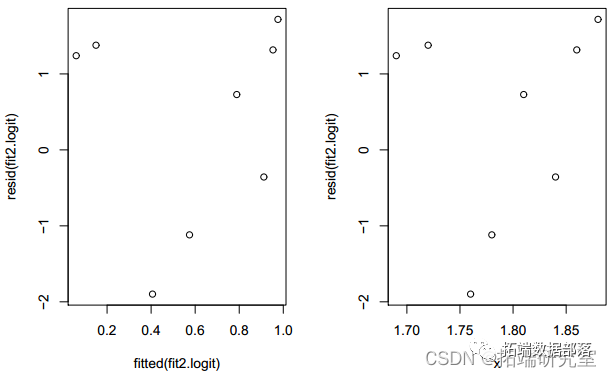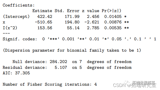 使用 probit 链接的模型略好于使用 logit 链接的模型,因为偏差更小。在两个模型中,x 的系数都很显着(P 值<0.01),这意味着效果随着剂量的增加而增加。