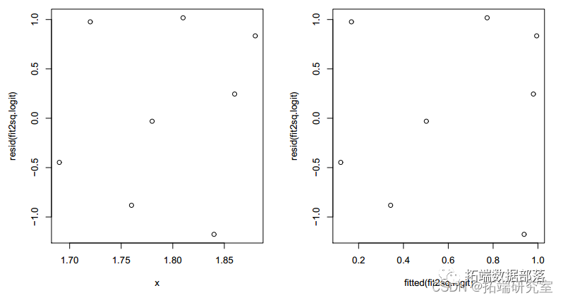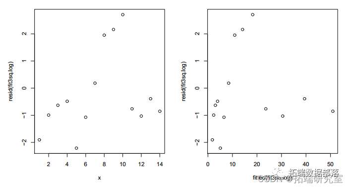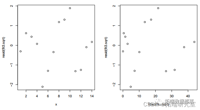 拟合模型的残差 y = (-0.27571 +0.49277x)2 + e 显示出更加随机的模式。12 df 上的偏差 16.905 略高于之前模型的 16.371(df=11),但仍然不显着(P 值=0.1532>0.10)。AIC 较小,为 73.833<75.298。因此,具有平方根链接的模型是首选。