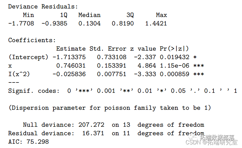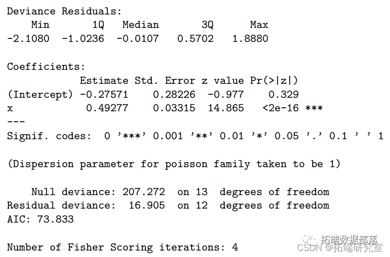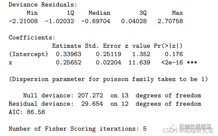 a) 我们输入数据并使用默认对数链接拟合泊松回归模型。