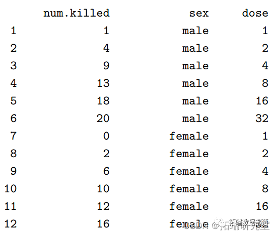 num.killed <- scan()1 4 9 13 18 20 0 2 6 10 12 16sex <- scan()0 0 0 0 0 0 1 1 1 1 1 1dose <- scan()1 2 4 8 16 32 1 2 4 8 16 32