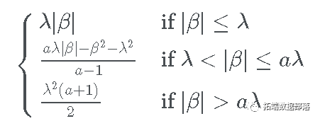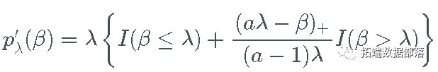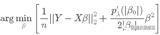 Fan和Li(2001)提出的平滑剪切绝对偏差(SCAD)惩罚,旨在鼓励最小二乘法问题的稀疏解,同时也允许大值的 β。SCAD惩罚是一个更大的系列,被称为 "折叠凹陷惩罚",它在以下方面是凹的, R+ 和 R-。从图形上看,SCAD 惩罚如下所示: