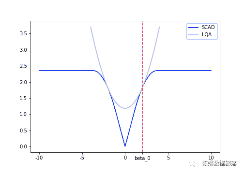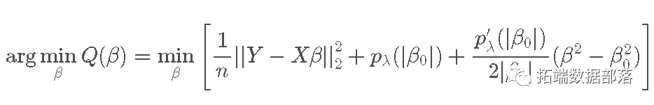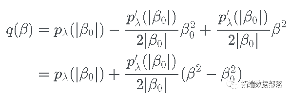 拟合惩罚最小二乘模型(包括 SCAD 惩罚模型)的一种通用方法是使用局部二次近似。这种方法相当于在初始点 β0 周围拟合二次函数 q(β),使得近似: