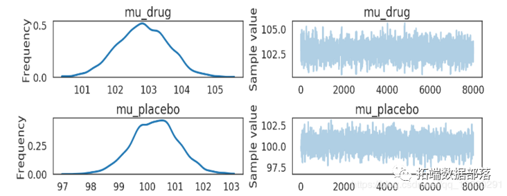 varnames=['mu_drug', 'mu_placebo'])