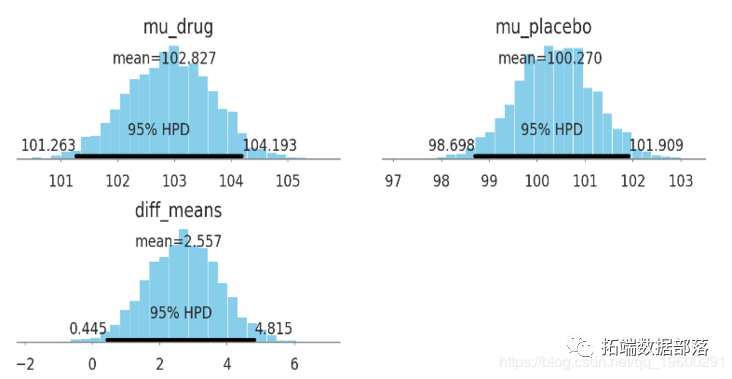 varnames=['mu_drug', 'mu_placebo', 'diff_means'])