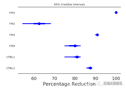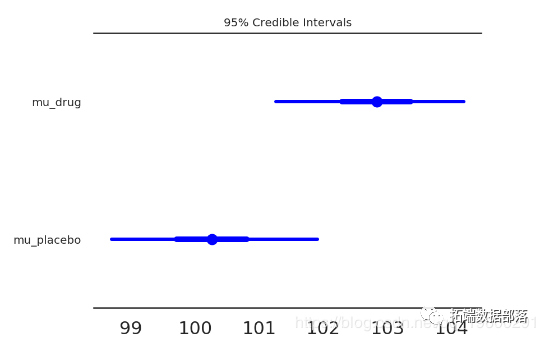 森林图:在同一轴上的95%HPD(细线),IQR(粗线)和后验分布的中位数(点),使我们能够直接比较治疗组和对照组。