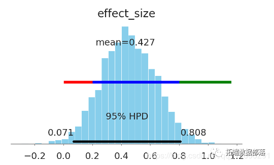 效果大小(Cohen's d, 效果微小, 效果中等, 效果很大)可以从微小到很大(95%HPD [0.0,0.77])。