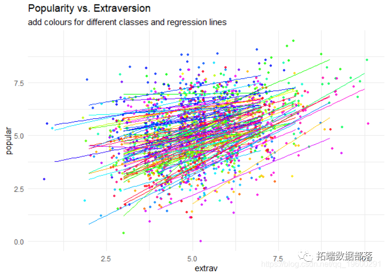 我们清楚地看到,外向性和受欢迎程度之间的关系在所有层级中并不相同,但平均而言,存在明显的正向关系。在本教程中,我们将显示这些不同斜率的估计值(以及如何解释这些差异)。