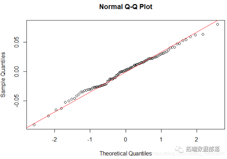 我们还可以使用QQ图检查残差的正态性。该图确实表明残差是正态分布的。