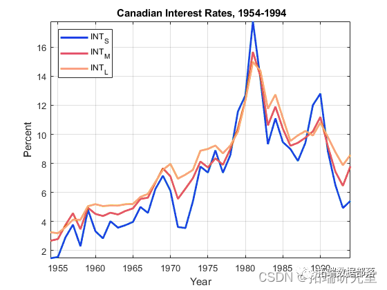 假设具有 H1 Johansen 形式的 VEC(2) 模型恰当地描述了由 1954 年至 1994 年的年度短期、中期和长期债券利率组成的 3D 多元时间序列的动态。