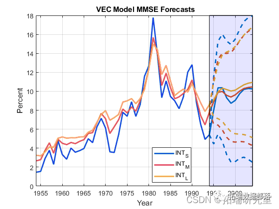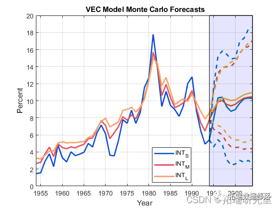 此示例说明如何从 VEC( q ) 模型生成 Monte Carlo 预测。该示例将生成的预测与最小均方误差 (MMSE) 预测和来自VEC( q ) 模型的 VAR( _q_ +1) 模型的预测进行比较。