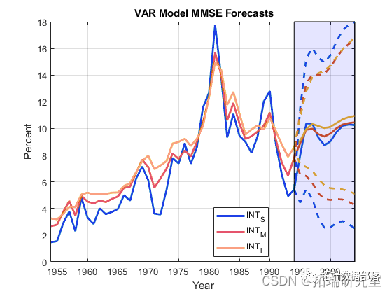 使用 VAR 模型估计 10 年的 MMSE 预测 forecast