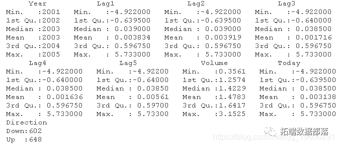 summary()函数为你提供了数据框架上每个变量的简单总结。你可以看到有成交量,收盘价,和涨跌方向。你将使用 "涨跌方向 "作为因变量,因为它显示了自前一天以来市场是上涨还是下跌。
