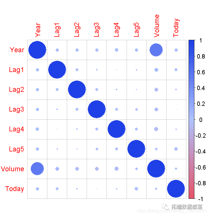 使用点表示法,蓝色代表正相关,红色代表负相关。点越大,相关度越大。你可以看到矩阵是对称的,对角线是完全正相关的,因为它显示了每个变量与自身的相关性。但是,没有一个变量是相互关联的。