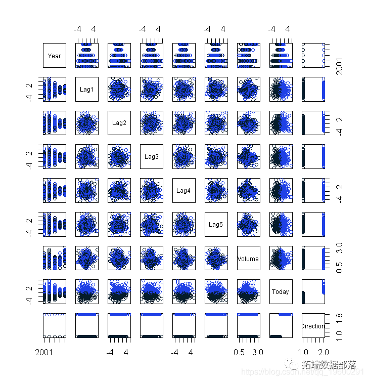 我们来做一个数据图。有一个pair()函数可以将Smarket中的变量绘制成一个散点图矩阵。在这种情况下,"涨跌方向",你的二元因变量,是颜色指标。