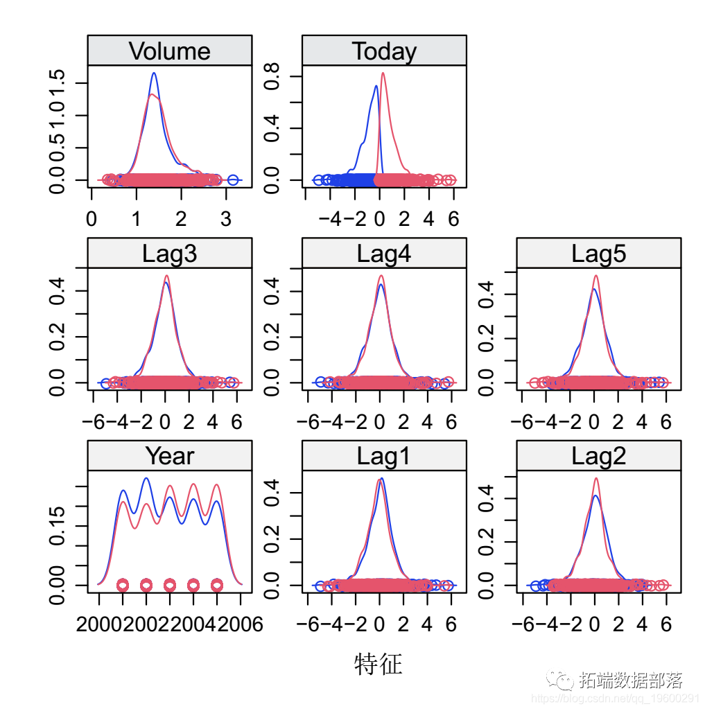 让我们来看看按方向值细分的每个变量的密度分布。像上面的散点图矩阵一样,按方向绘制的密度图可以帮助看到涨和跌的方向。它还可以帮助了解一个变量的方向的重叠情况。