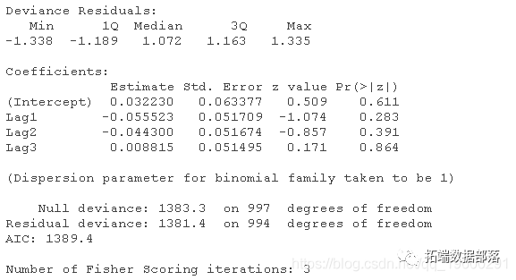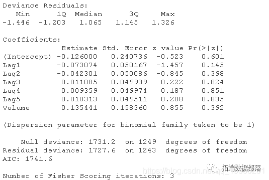 现在你调用glm.fit()函数。你传递给这个函数的第一个参数是一个R公式。在这种情况下,该公式表明方向是因变量,而滞后和成交量变量是预测因素。正如你在介绍中看到的,glm通常用于拟合广义线性模型。