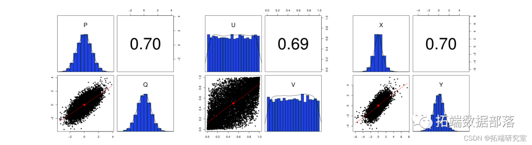 set.seed(206) # 确保可重复性# 创建 copula 对象 normalCopula(param = 0.7, dim = 2)# 模拟n <- rCopula(10000, normCop)# 绘图par(mfrow = c(2, 2))
