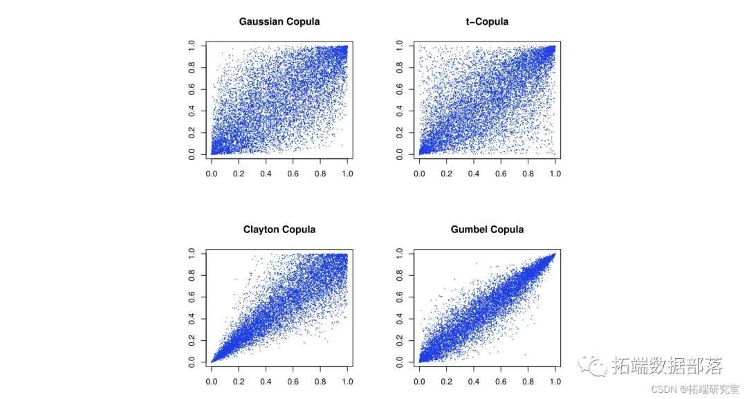 加强您对 copula 类和族的理解。通过使用散点图,我们强调了 Gaussian、t、Clayton 和 Gumbel copula 之间的差异。
