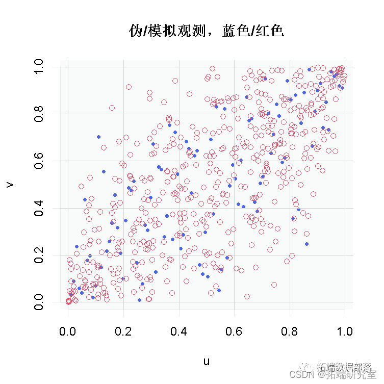 通过绘制伪观测值和模拟观测值,我们可以看到使用copula的模拟与伪观测值的匹配情况。