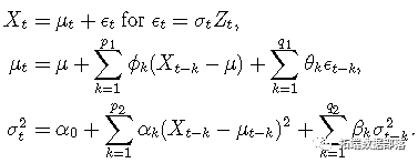 现在我们使用依赖于 copula 来模拟两个 ARMA(1,1)-GARCH(1,1) 过程。ARMA(p1,q1)-GARCH(p2,q2) 模型由下式给出