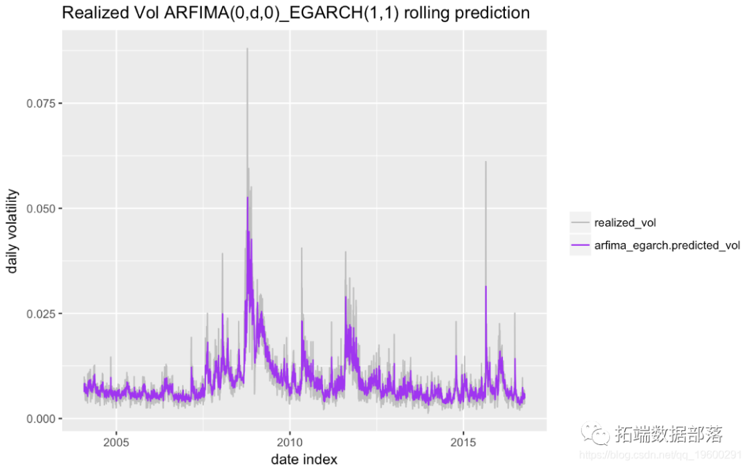 我用4189个观测值进行了回测(从2000-01-03到2016-10-06),使用前1000个观测值训练模型,然后每次向前滚动预测一个,然后每5个观测值重新估计模型一次 。下图显示 了样本外 预测和相应的实际波动率。