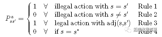 最后,一旦达到目标状态s ∗ s ∗,我们就不希望代理再次离开。为了说明这一点,我们引入了最终规则: