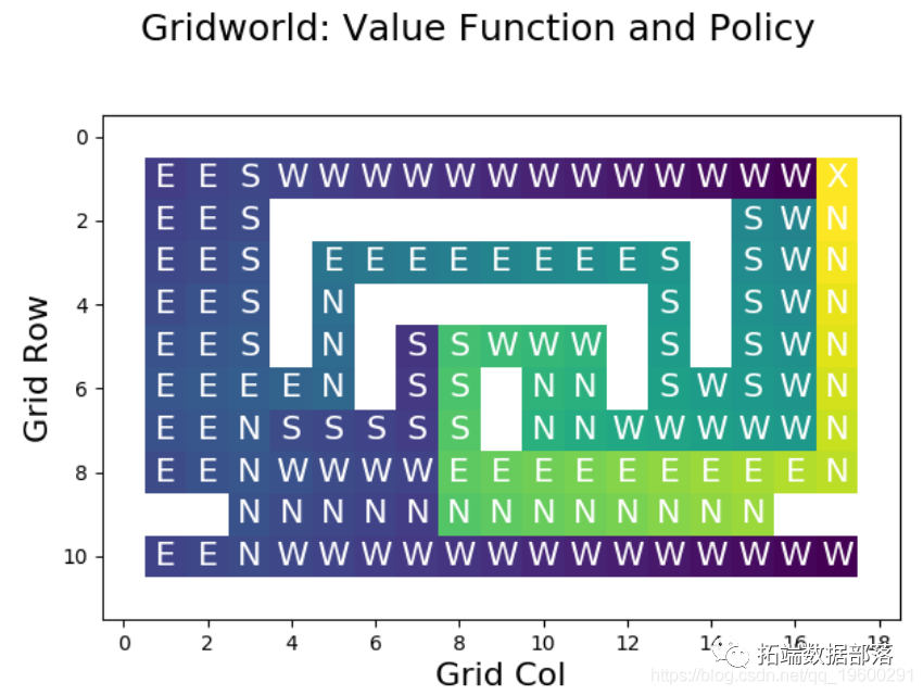 查看这些值,我们可以看到结果与策略规定的操作相匹配。例如,直接位于目标西侧的状态的值非常低,因为该状态的动作(GO_WEST