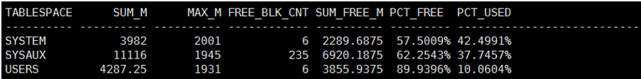 Select Tablespace_Name,Sum_m,Max_m,Count_Blocks Free_Blk_Cnt,Sum_Free_m,To_Char(100 * Sum_Free_m Sum_m, '99.9999') || '%' As Pct_Free,100 - To_Char(100 * Sum_Free_m Sum_m, '99.9999') || '%' As Pct_usedFrom (Select Tablespace_Name, Sum(Bytes) 1024 1024 As Sum_mFrom Dba_Data_FilesGroup By Tablespace_Name)Left Join (Select Tablespace_Name As Fs_Ts_Name,Max(Bytes) 1024 1024 As Max_m,Count(Blocks) As Count_Blocks,Sum(Bytes 1024 1024) As Sum_Free_mFrom Dba_Free_SpaceGroup By Tablespace_Name)On Tablespace_Name = Fs_Ts_NameORDER BY Sum_Free_m Sum_m;