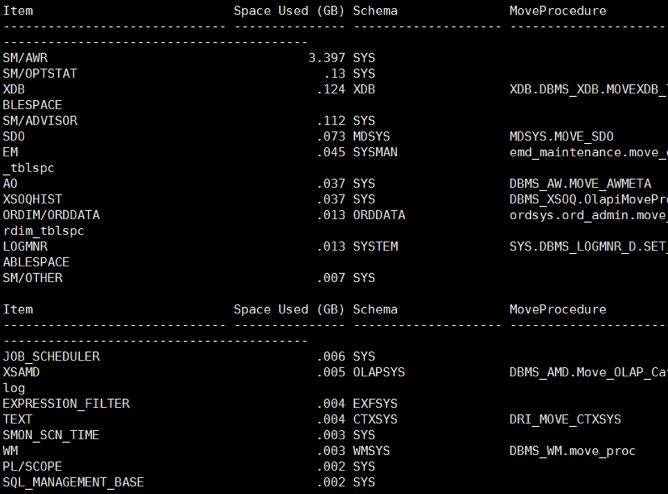 SQL> col Item for a30SQL> col Schema for a20SQL> set lines 200SQL> SELECT occupant_name"Item",round(space_usage_kbytes/1024/1024,3)"Space Used (GB)",schema_name "Schema",move_procedure "MoveProcedure"FROM v$sysaux_occupantsORDER BY 2 Desc;