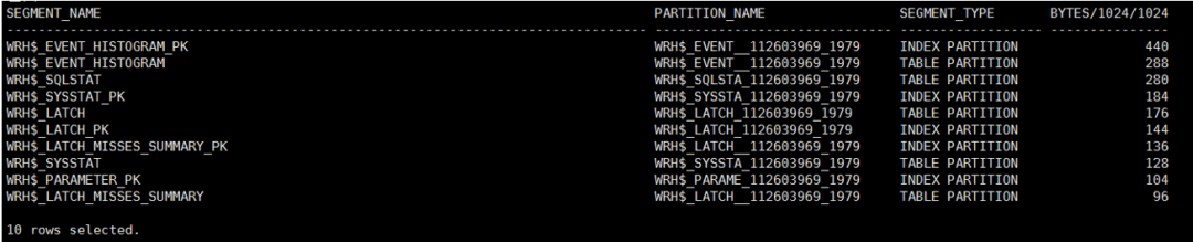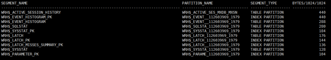 查找WRH$表发现这些基表中有相同的字段snap_id,我们就利用这个字段进行处理,先利用snap_id进行大基表的备份。