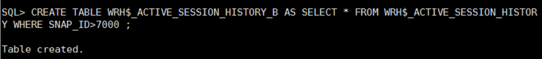 CREATE TABLE WRH$_ACTIVE_SESSION_HISTORY_B ASSELECT * FROM WRH$_ACTIVE_SESSION_HISTORY WHERE SNAP_ID>7000 ;