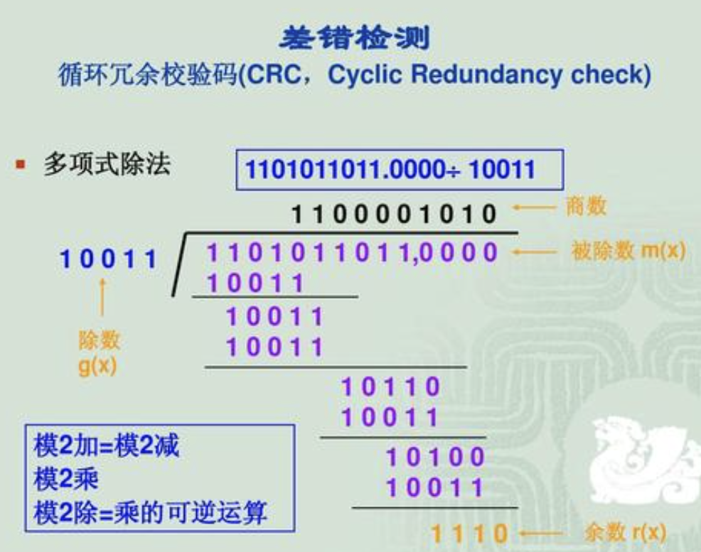 (4)当以上新帧到达接收端后,接收端会把这个新帧再用上面选定的除数11001以“模2除法”方式去除,验证余数是否为0,如果为0,则证明该帧数据在传输过程中没有出现差错,否则出现了差错。