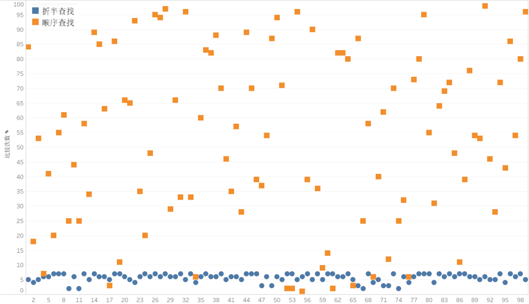 如上图,在100次对比测试中,蓝色圆形代表的折半查找,其查找的次数总是很平均,大致在0~10这个区间中;而代表顺序查找的桔色方形,则偏差很大。尽管个别情况下,出现顺序查找的比较次数较少,但大多数情况下还是折半查找的比较次数少。为了便于说明,还做了个统计图。