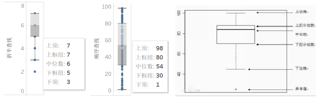 为了更形象的对比,这里引入了箱式图,做了个统计图。(顺便普及下统计学,呵呵)。在折半查找中,其比较次数的范围在3~7之间,中位数在6。简单理解,就是平均比较6次就能得到结果。而使用顺序查找的方式,比较次数的范围则在1~98,中位数在54,也就是说平均要比较接近一半(100/2=50),才能找到目标值。