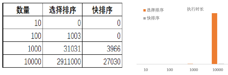 针对这两种算法,可对比下其执行时长。这里通过对比不同数量级下,执行排序的时长加以说明。下图是对10、·100、1000、10000个随机数,使用不同算法的比较,单位是微秒。从中可以看出快排序要明显快于选择排序。