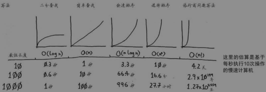 如上面两类算法比较可见,不同算法的执行效率差别很大,那么如何比较不同算法的执行时长呢?这里引入了一个方法—大O表示法。它并不是以秒为单位的速度比较,而是通过比较操作数,衡量出算法运行时间的增速。借用书中的原图,表示常见的几个算法的执行效率。