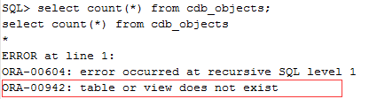 某日,一哥们过来说一套CDB库在CDB中无法查询cdb_objects,上去一看发现RAC几个节点均报ORA-00942: