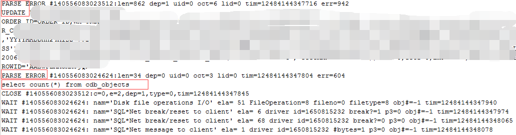 在trace日志中我们发现查询cdb_objects的SQL解析失败了,与此同时也有一些业务SQL也是解析失败的。