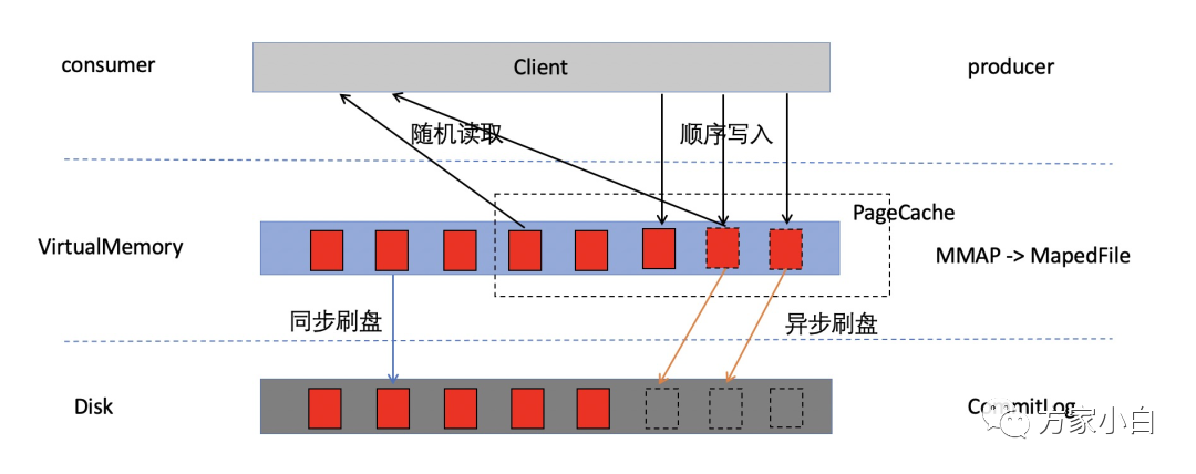 中的消息积累到一定的量时,触发一次写操作,或者定时等策略将 PageCache