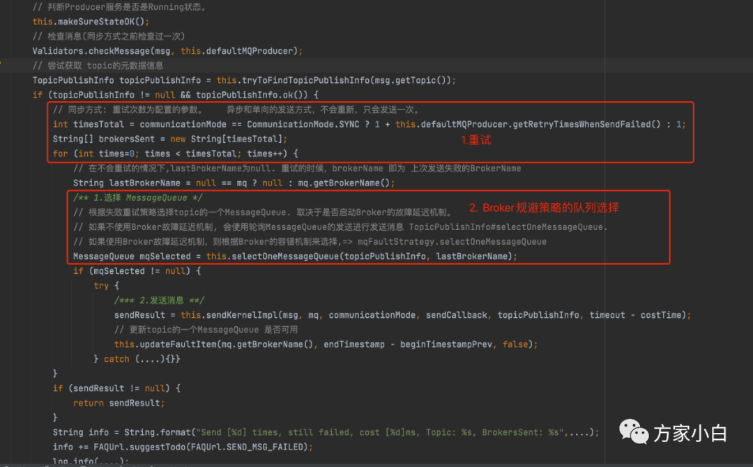 具体实现的代码在 org.apache.rocketmq.client.impl.producer.DefaultMQProducerImpl#sendDefaultImpl