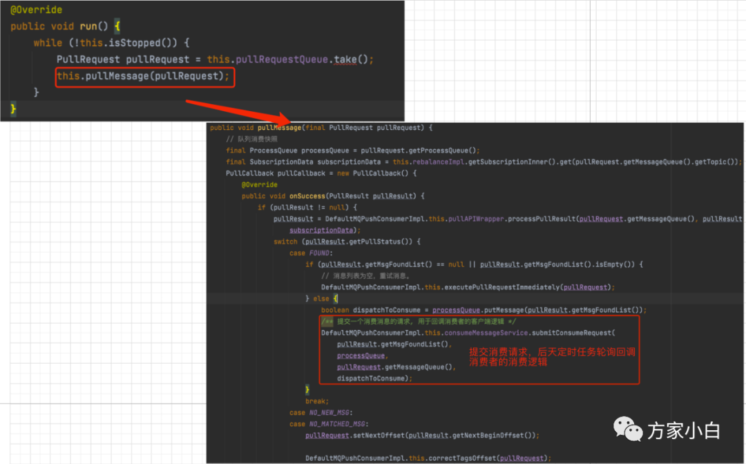 中拉取消息,拉取到之后直接调用客户端进行消费。