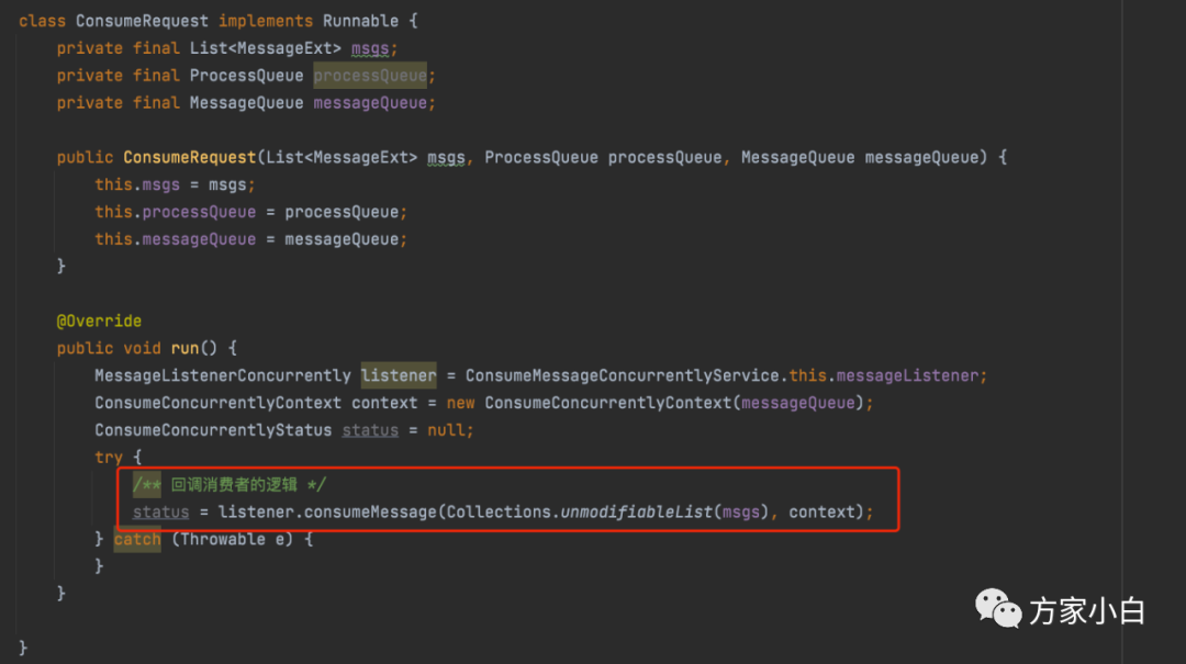 消费者客户端每一次拉取消息请求,如果有发现新的消息,那么都会将这些消息封装为 ConsumeRequest