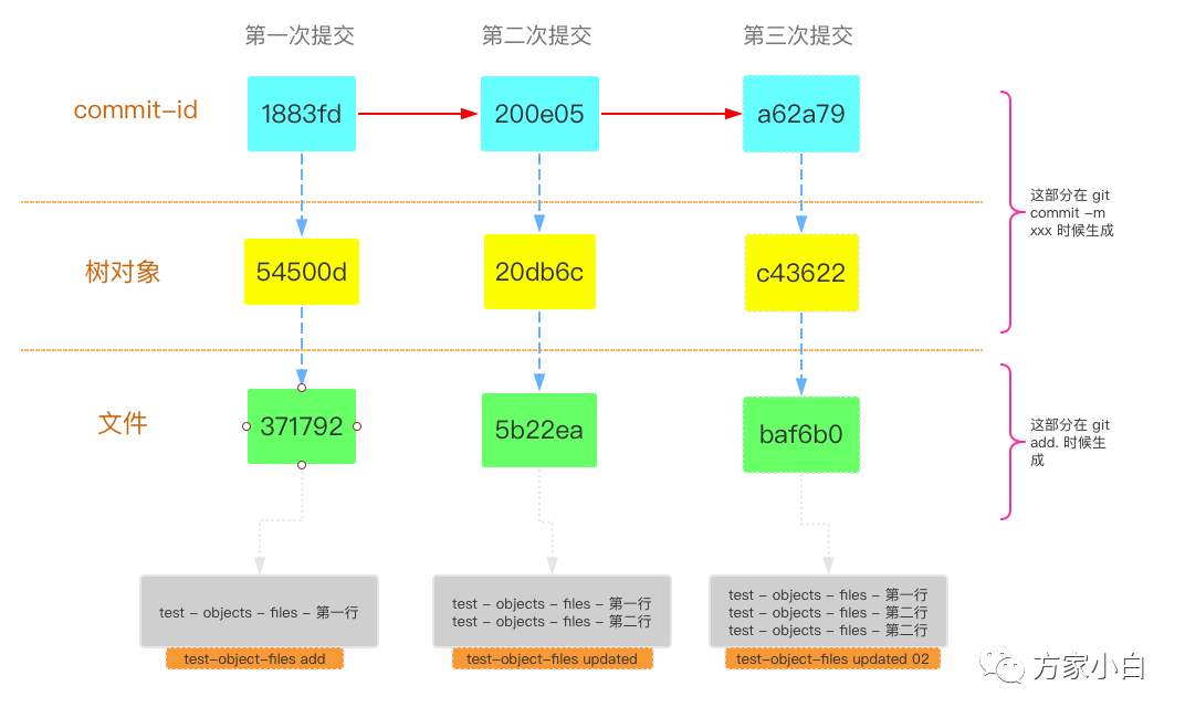 ➜ gitlearn git:(master) sh opt/util/dirfile.sh ./.git/objects./.git/objects/11/a5f11388c345846bbaa060a98d8e93a1114e99./.git/objects/18/83fd5aefeb430cb25150e531e92e38f0176f0d./.git/objects/20/0e059f0c0b178378aecd6736f384a74d28df94./.git/objects/20/db6c4af7677b7509d2b323b503733405e4987e./.git/objects/37/17929ecb3efabae427dbe3725654b3de1a114b./.git/objects/54/500d5d74f828d1a3193fb685084b87aaf419c7./.git/objects/5b/22ea83f2e8555371b818a7e441d4156795af04# 以下三行是本次commit产生的。./.git/objects/a6/2a79d99b37bc5c44ca083cd40f9e4c00aae0bd # commit-id,提交对象./.git/objects/ba/f6b0843a522f8e77f326d2615cb37ed290d06e # 文件,数据对象./.git/objects/c4/3622f1e8e728f88eb11adfee1ea08d41c792a0 # 树对象➜ gitlearn git:(master) git cat-file -p a62a79d99b37bc5c44ca083cd40f9e4c00aae0bdtree c43622f1e8e728f88eb11adfee1ea08d41c792a0parent 200e059f0c0b178378aecd6736f384a74d28df94test-object-files updated 02➜ gitlearn git:(master) git cat-file -p c43622f1e8e728f88eb11adfee1ea08d41c792a0100755 blob baf6b0843a522f8e77f326d2615cb37ed290d06e test-objects-files-01.txt➜ gitlearn git:(master) git cat-file -p baf6b0843a522f8e77f326d2615cb37ed290d06etest - objects - files - 第一行test - objects - files - 第二行test - objects - files - 第三行
