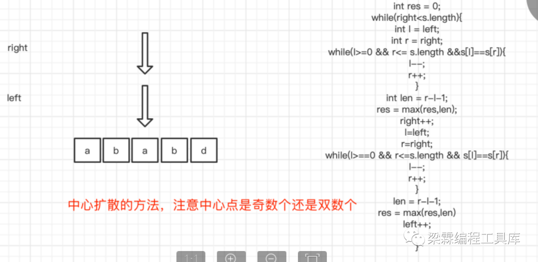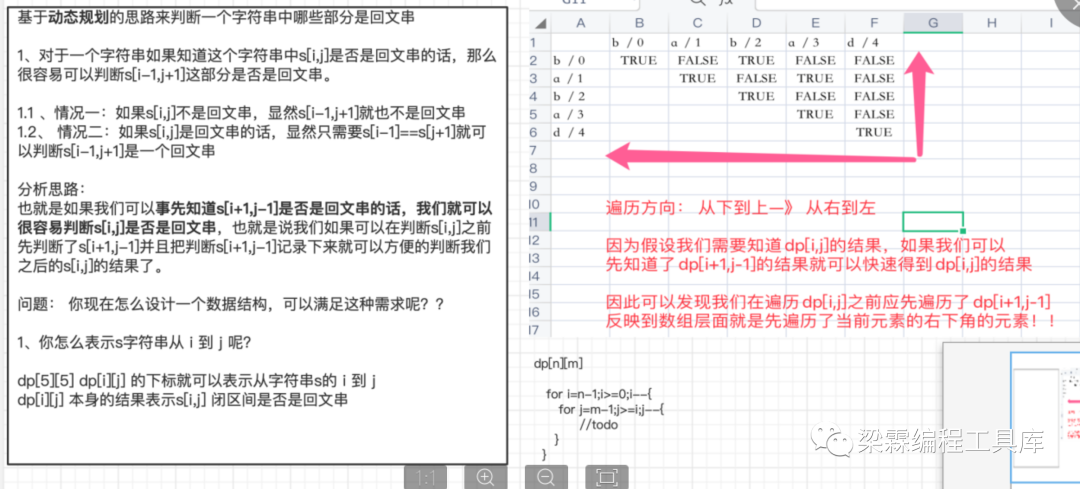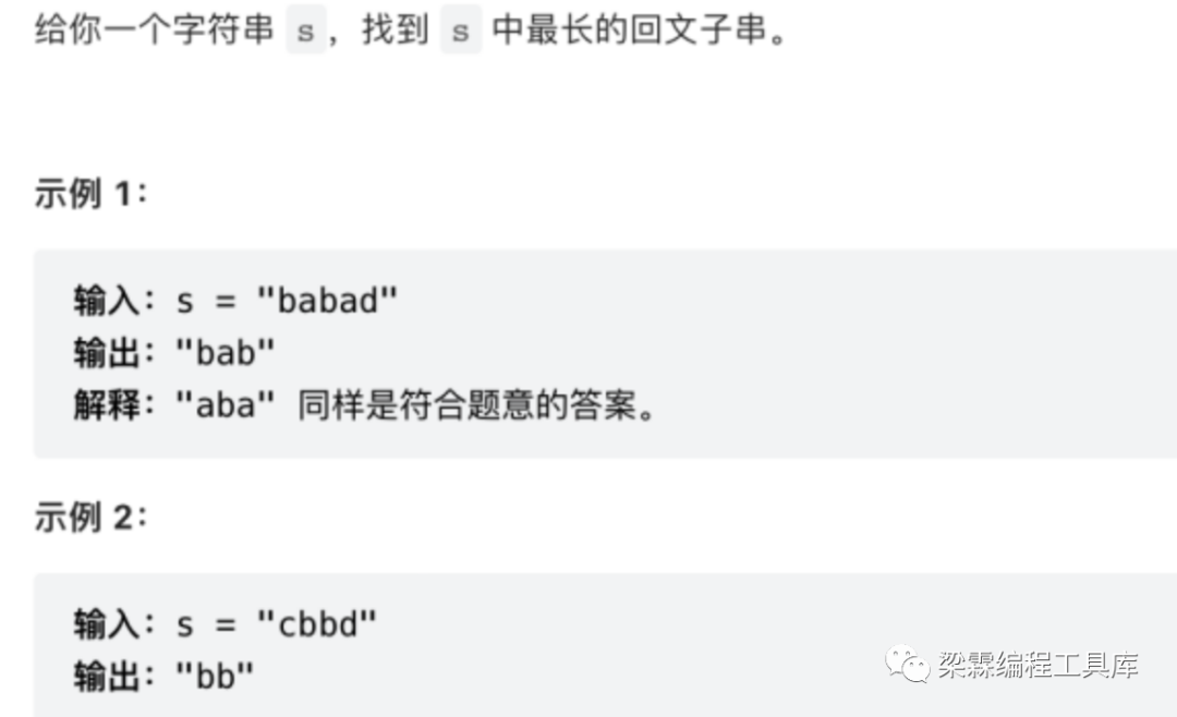 class Solution {public:string longestPalindrome(string s) {vector<vector<bool>> dp(s.size(), vector<bool>(s.size(),false));bool arr[s.size()][s.size()];初始化for(int i=0;i<s.size();i++){dp[i][i]=true;arr[i][i] = true;}int res = 1;int from = 0;for(int i=s.size()-1;i>=0;i--){for(int j=s.size()-1;j>=i;j--){if(i==j){continue;}else if(j-i==1){if(s[i]==s[j]){dp[i][j]=true;if(j-i+1 > res){res = j-i+1;from = i;}}else{arr[i][j]=false;}}else{if(dp[i+1][j-1] && s[i]==s[j]){dp[i][j]=true;if(j-i+1>res){res = j-i+1;from = i;}}}}}return s.substr(from,res);}};