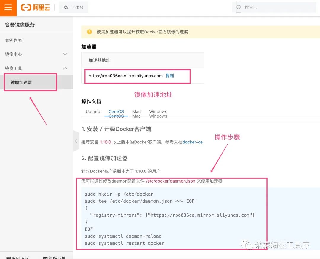 2、按下面图的操作文档进行,就是修改/etc/docker/daemon.json 配置文件