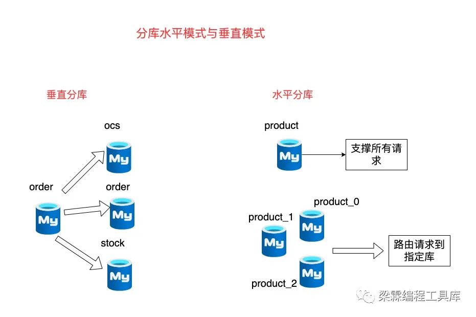分库就是将原本由一个数据库承载的数据分摊到多个数据库中,常见的有水平分库和垂直分库。