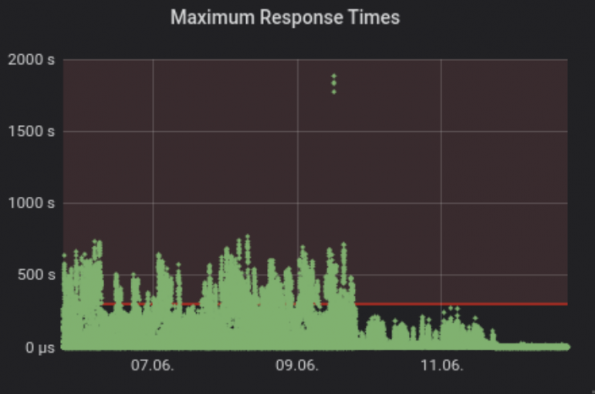 为了解决这个问题,CERN重新启用了分页,并将同步间隔从60秒改为1小时。你可以从下图中看到此解决方案如何影响响应时间。为了更具可扩展性,CERN引入了“Inspector Leader Election”,这是CERN与上游一起开发的,现已部署到生产中。Inspector Leader Election将在Victoria版本中提供。